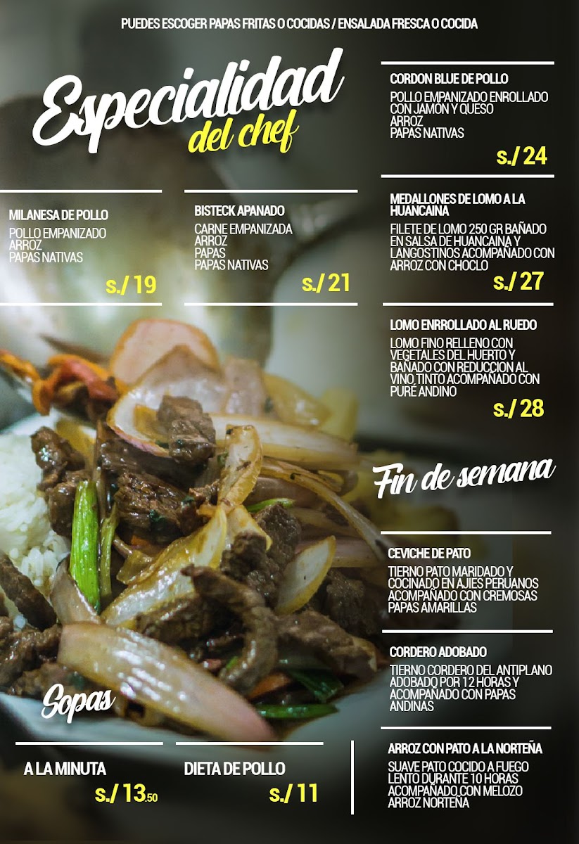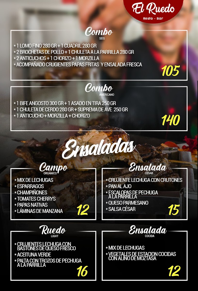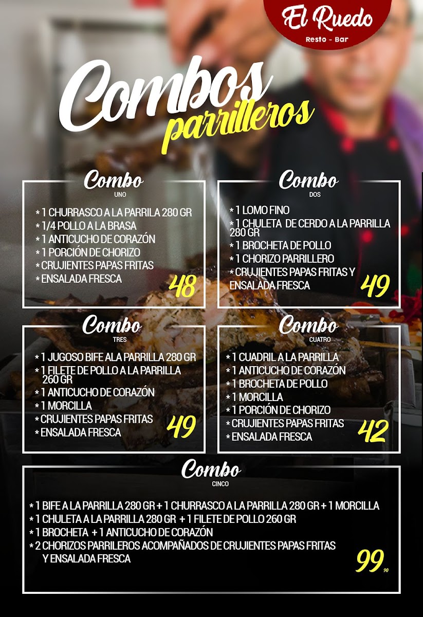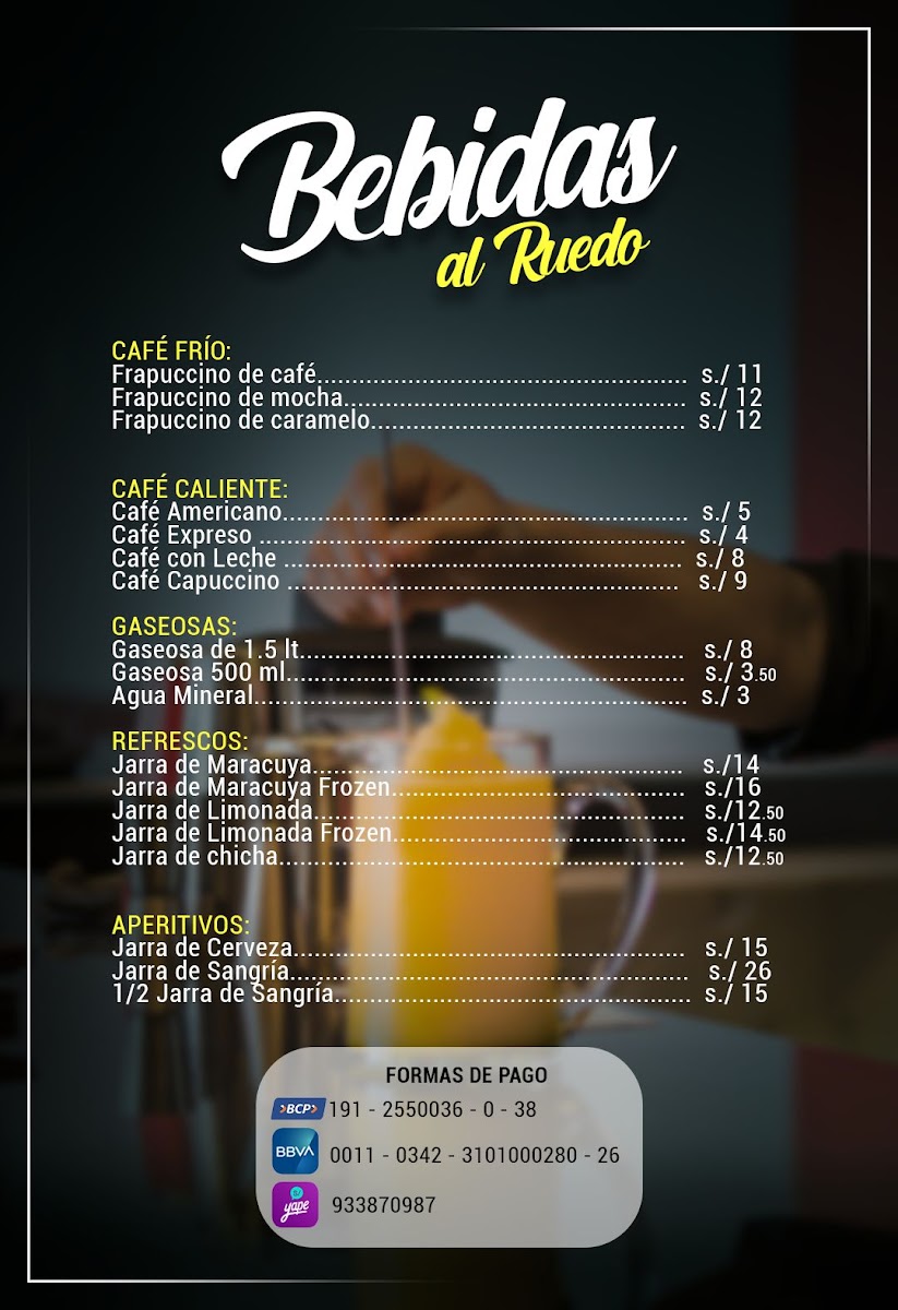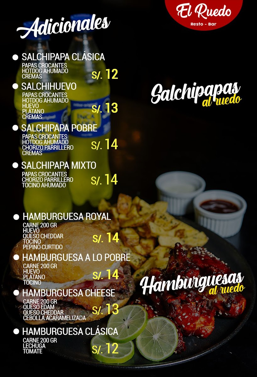 At El Ruedo Pollos Y Parrillas - San Pedro, located at Av. José Saco Rojas Mz A9, Carabayllo 15121, Peru, the menu comes together as a clear reflection of comfort, variety, and balance between food and drinks. From the bar, classics like Cosmopolitan, Mejores Cocteles, Coctel, Mojito, and the refreshing Parrilla Para 4 Personas Y Un Cóctel de Piña Colada highlight a cocktail selection that feels social and easygoing, perfect for sharing or pairing with grilled dishes. On the savory side, the kitchen leans confidently into Peruvian-inspired flavors and familiar favorites. Frijoles Con Seco de Pato stands out as a hearty, traditional option with deep, slow-cooked character, while Pollo A la Brasa Con Cremas delivers the expected smoky tenderness that defines rotisserie chicken culture, elevated by its accompanying sauces. For lighter or simpler preferences, Pollo A la Plancha offers a straightforward grilled alternative without sacrificing flavor. The menu also embraces casual street-style comfort with Hamburguesa Royal Y Salchipapa Clásica, appealing to diners looking for something familiar, filling, and satisfying. Taken together, these highlighted items show a menu designed to please different tastes in one sitting-combining grilled meats, classic plates, and well-known cocktails-making the overall dining experience feel complete, relaxed, and well thought out for groups, families, or anyone looking to enjoy both food and drinks in a single visit.